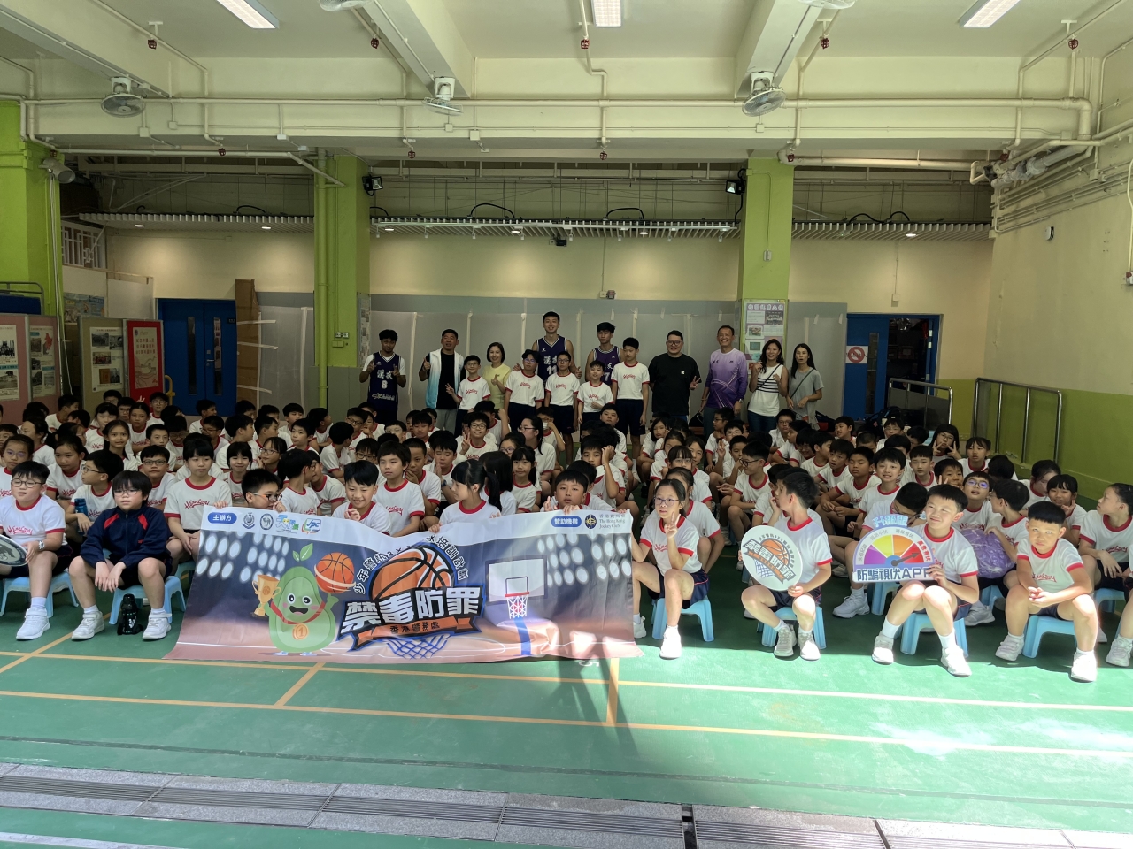 202595日,學校參加了由香港警務處港島總區防止罪案辦公室舉辦的防騙、禁毒三人籃球活動,由香港甲一漢友籃球隊球員帶領五年級同學進行這項活動。同學們在體驗三人籃球比賽的同時,能夠與香港甲一籃球員互相切磋,都表現得相當興奮。