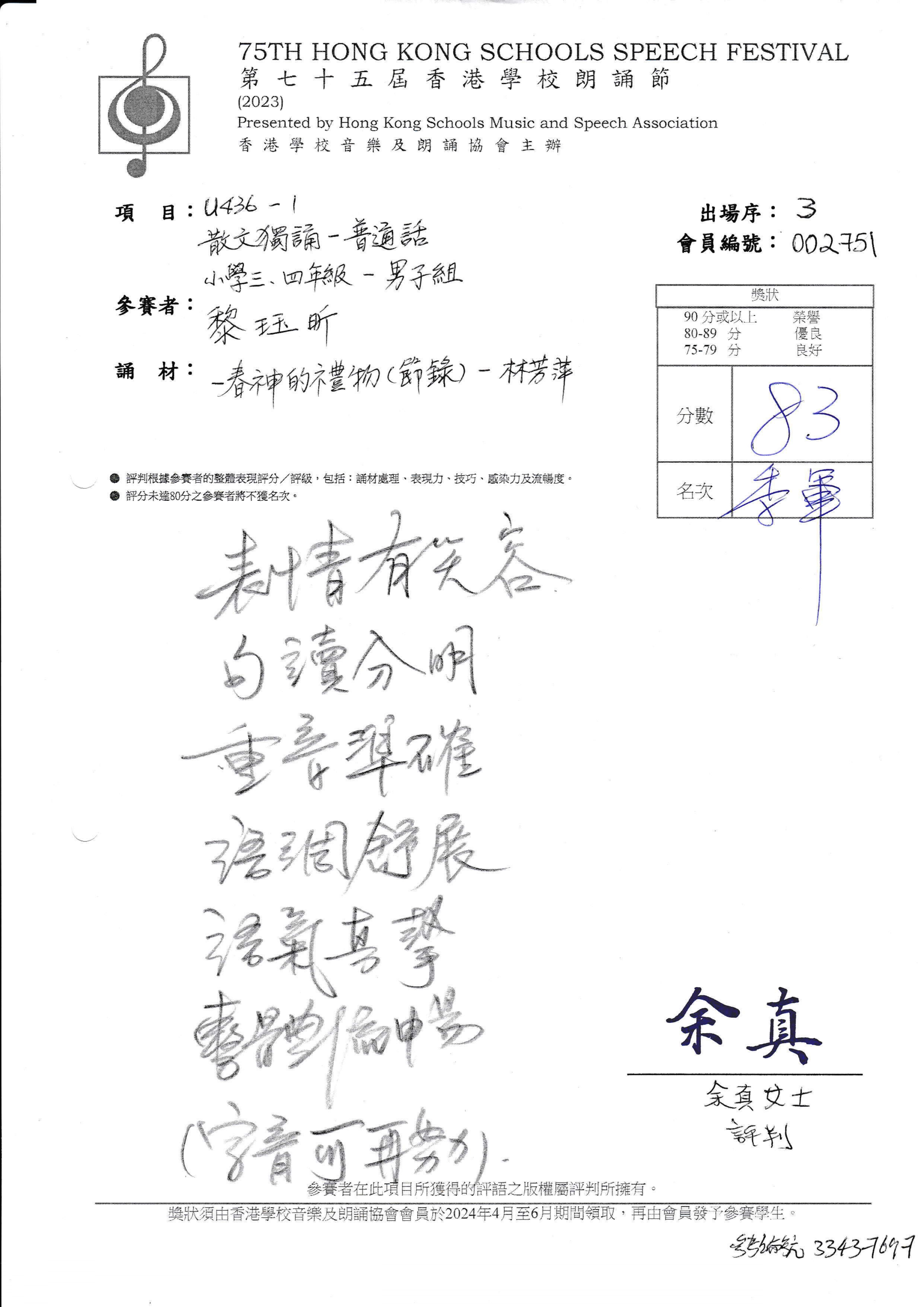 散文獨誦 - 普通話 - 男子組 - 小學三、四年級(季軍)舉辦日期:25/11/2023主辦機構:香港學校音樂及朗誦協會主辦 -
