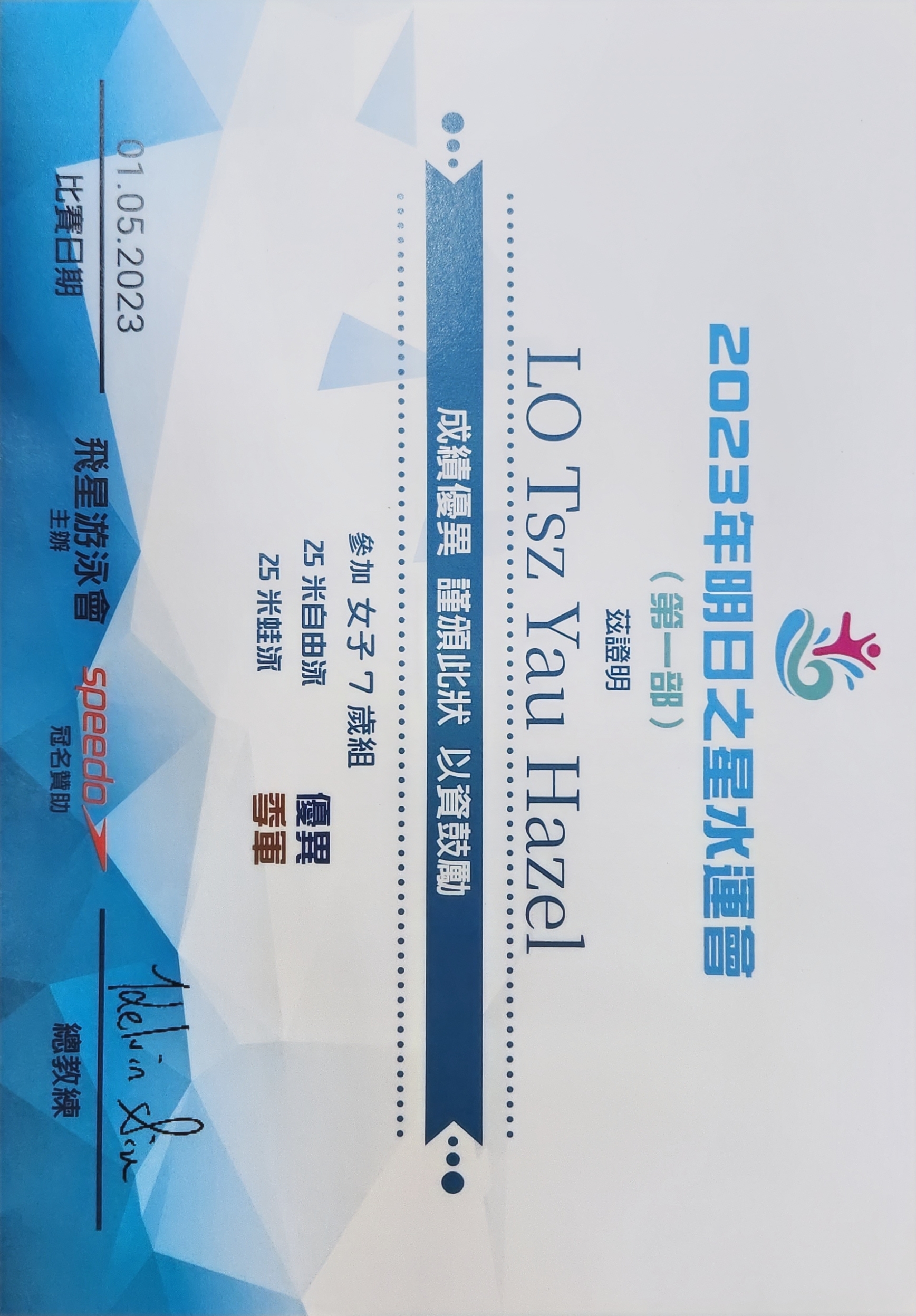 女子7歲組 25米自由泳(優異獎) 25米蛙泳(季軍)舉辦日期:01/05/2023主辦機構:飛星游泳會 -